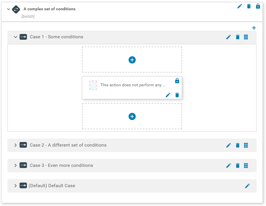 The first matching Case will be used. If no matches are found, the Default case will be chosen. The Default case may be left empty, or it may use a placeholder action to indicate that no work is to be done by default.